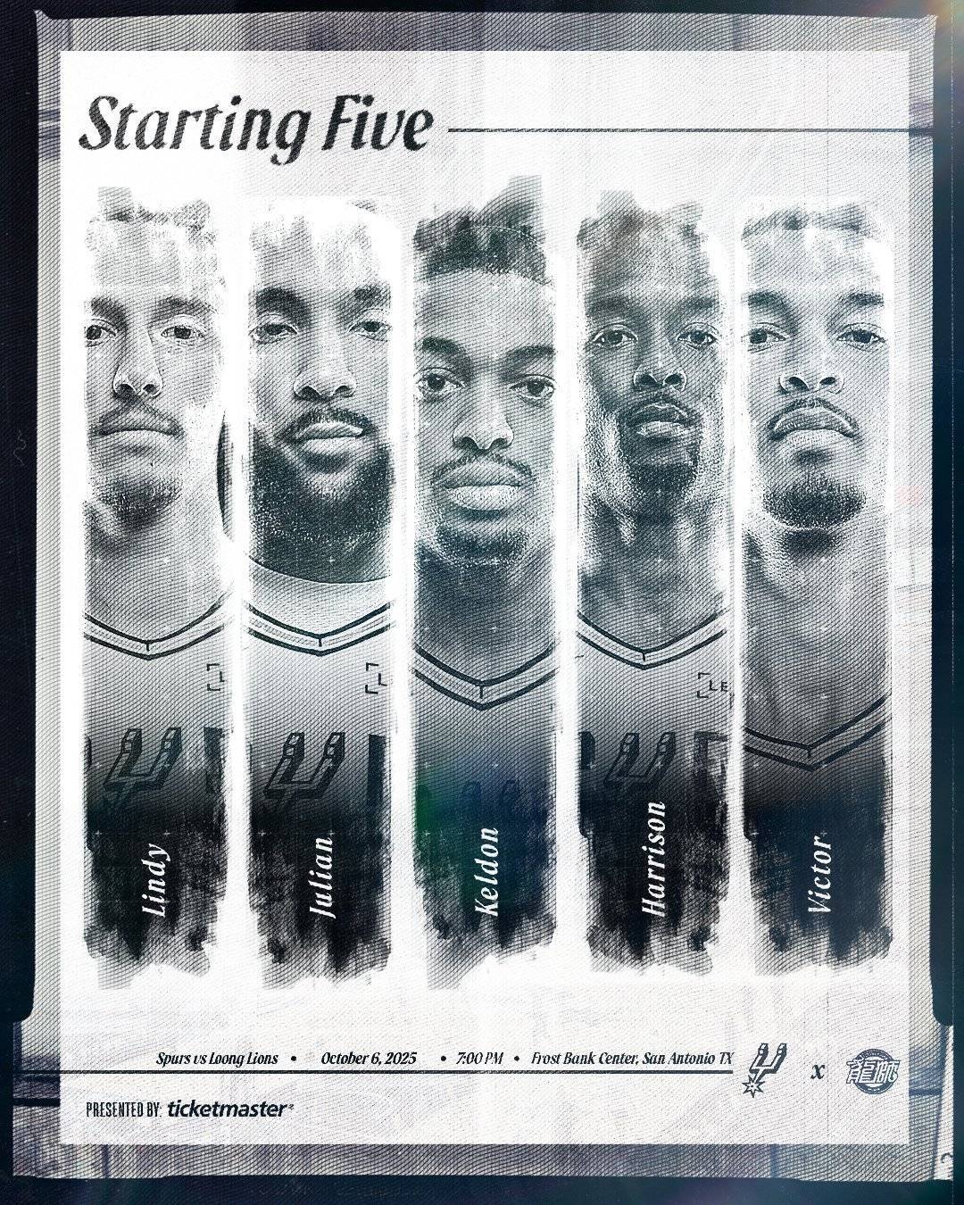 马刺:沃特斯、尚帕尼、凯尔登-约翰逊、哈里森-巴恩斯、文班亚马